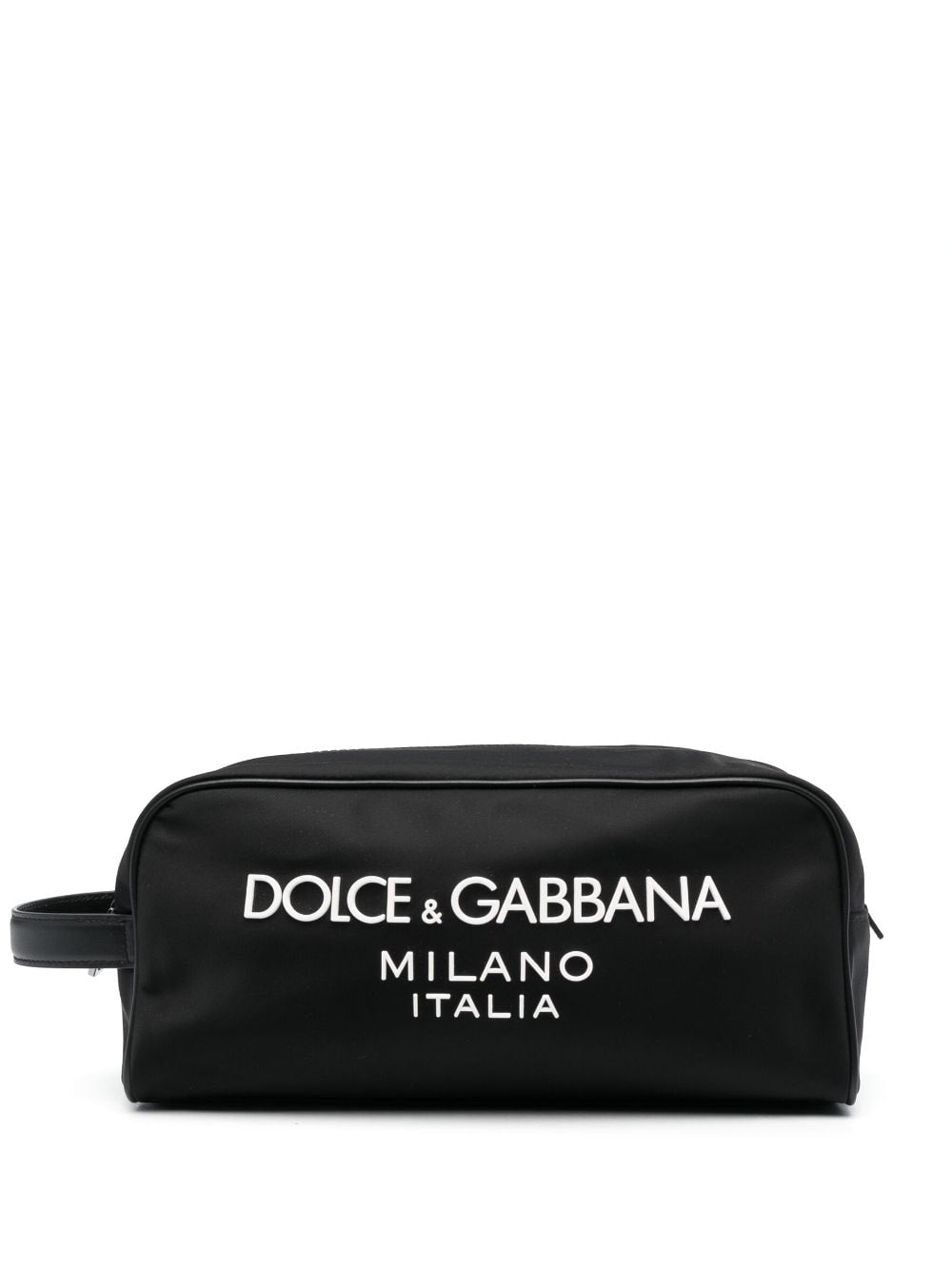 Nero logo-print wash bag from DOLCE & GABBANA featuring black, calf leather, logo print to the front, single flat side handle, top zip fastening, main compartment, internal logo patch and internal zip-fastening pocket. Nylon beauty-case Size and Fit - Width 9,84 in / 25 cm