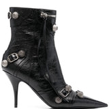 Black leather Cagole leather ankle boots from Balenciaga featuring crinkled finish, silver-tone stud detailing, decorative buckle detail, tassel detail, decorative zip detailing, side zip fastening, pointed toe, branded leather insole, ankle-length, black and 90mm stiletto heel. Le Cagole leather boots Size and Fit - Heel 3,5 in / 9 cm