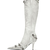 Cagole point-toe boots from BALENCIAGA featuring optical white, lambskin, pointed toe, stud embellishment, zip details, silver-tone hardware and stiletto heel. Le Cagole leather boots Size and Fit - Heel 9 cm