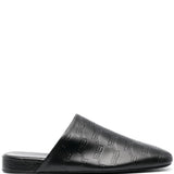 debossed-logo leather mules from BALENCIAGA featuring black, calf leather, all-over debossed logo print, slip-on style, round toe and flat leather sole. Cosy BB leather slippers Size and Fit - Heel 0,8 in / 2 cm