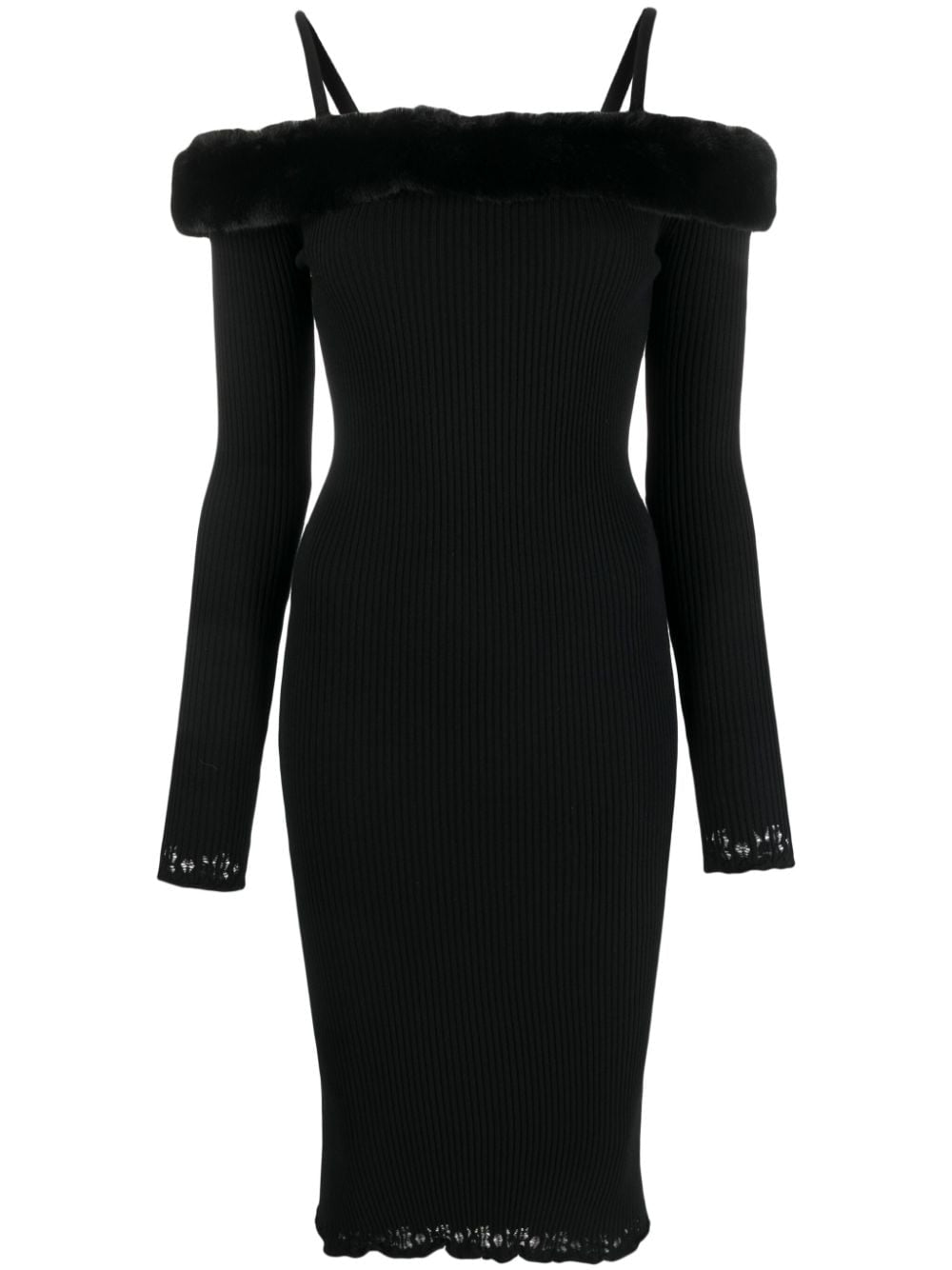 off-shoulder ribbed midi dress from BLUMARINE featuring black, ribbed knit, velvet trim, off-shoulder, adjustable spaghetti straps, long sleeves, below-knee length and scallop edge. Faux fur neck midi dress Size and Fit - This piece fits true to size. We recommend you get your regular size. Model is 1,75m / 5ft 8in wearing size S