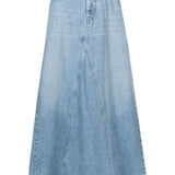 light blue cotton denim logo patch to the rear belt loops concealed fly and button fastening classic five pockets maxi straight hem Denim long skirt
