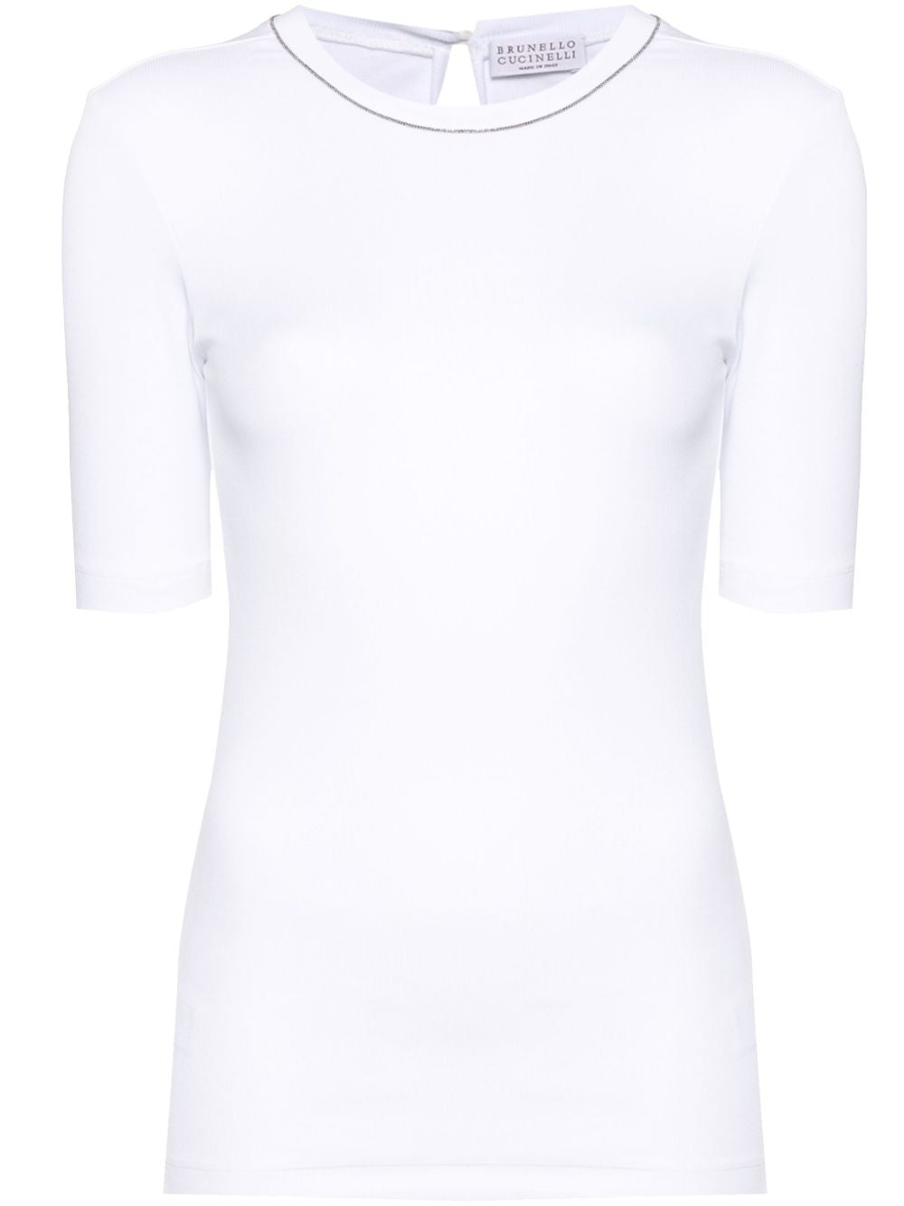 optical white cotton blend stretch-design crew neck signature Monili chain detail short sleeves straight hem rear button fastening Cotton t-shirt Size and Fit - This piece fits true to size. We recommend you get your regular size. Model is 1,75m / 5ft 8in wearing size S