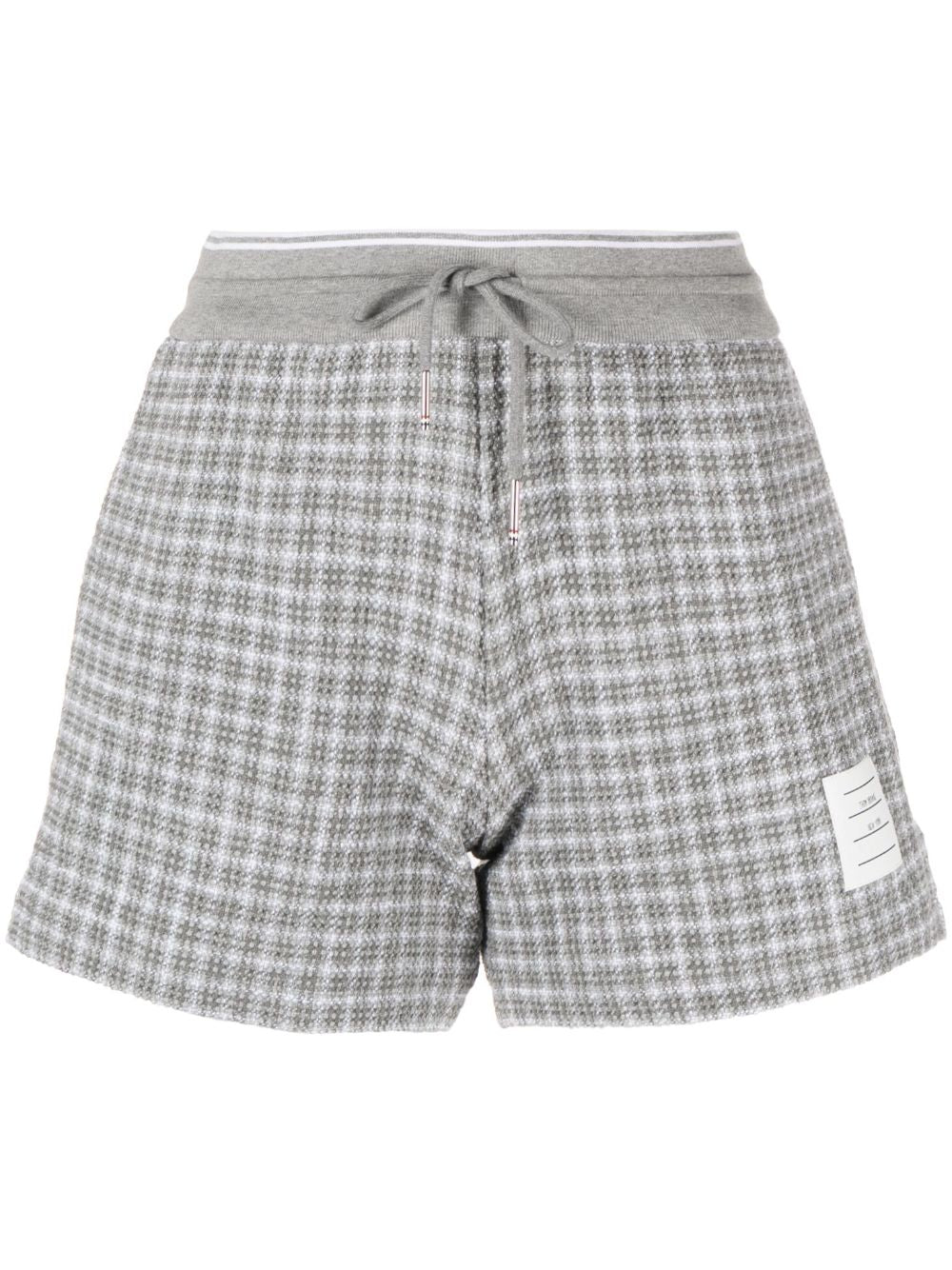 checked tweed track shorts from THOM BROWNE featuring light grey, off-white, cotton, check print, logo patch to the front, elasticated drawstring waistband and two side slit pockets. Tweed cotton shorts Size and Fit - This piece fits true to size. We recommend you get your regular size. Model is 1,75m / 5ft 8in wearing size 40 (IT)