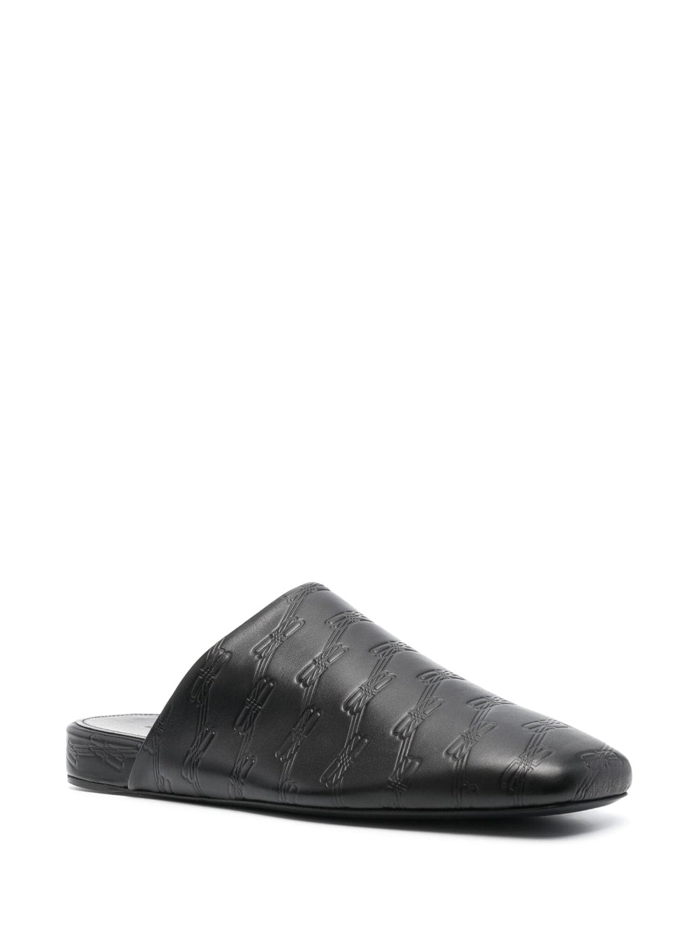 debossed-logo leather mules from BALENCIAGA featuring black, calf leather, all-over debossed logo print, slip-on style, round toe and flat leather sole. Cosy BB leather slippers Size and Fit - Heel 0,8 in / 2 cm